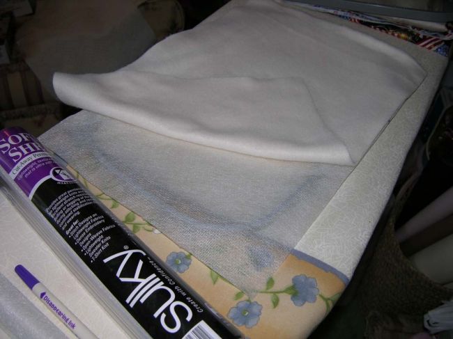 4. Put light weight water soluble tear away stabilizer on top of the fleece. This tears away when embroidery is finished, and the smaller bits wash away with a squirt bottle or quick rinse. It keeps the loft of the polar fleece down and causes the embroidery thread to lay smoothly on top of the fabric, not sink down into the pile and disappear or show fleece through the stitches. This step produces spectacular embroidery, so don't skip it.