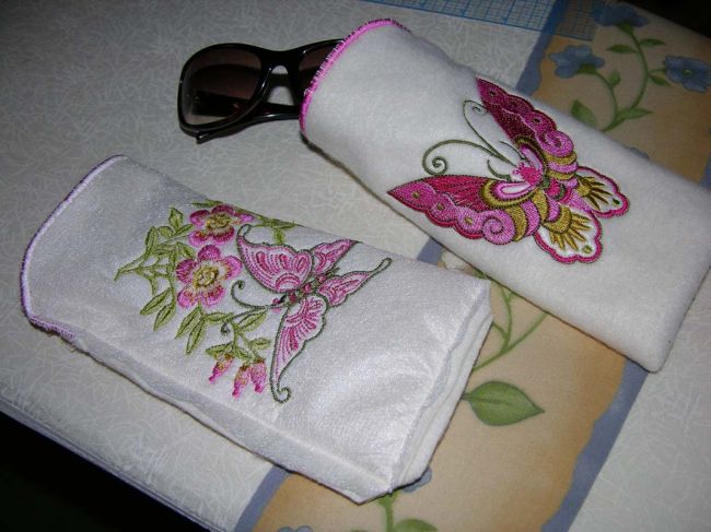 I LOVE how this design set pops out when sewn on polar fleece, so was eager to make some sunglass cases to fill as goody bags for my daughter's eleventh birthday this summer. The finished sunglass case measures 7 inches long by 3 1/2 inches wide and fits even large wrap around style glasses with ease. If you have an embroidery sewing machine with basic construction capabilities, straight stitch and satin or zigzag stitch, you can make several of these in a day!
