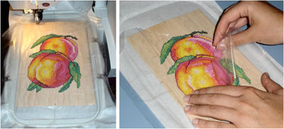 When the design is ready, take the hoop out and very carefully tear away the topping, one layer after another (NOT together). If you notice
